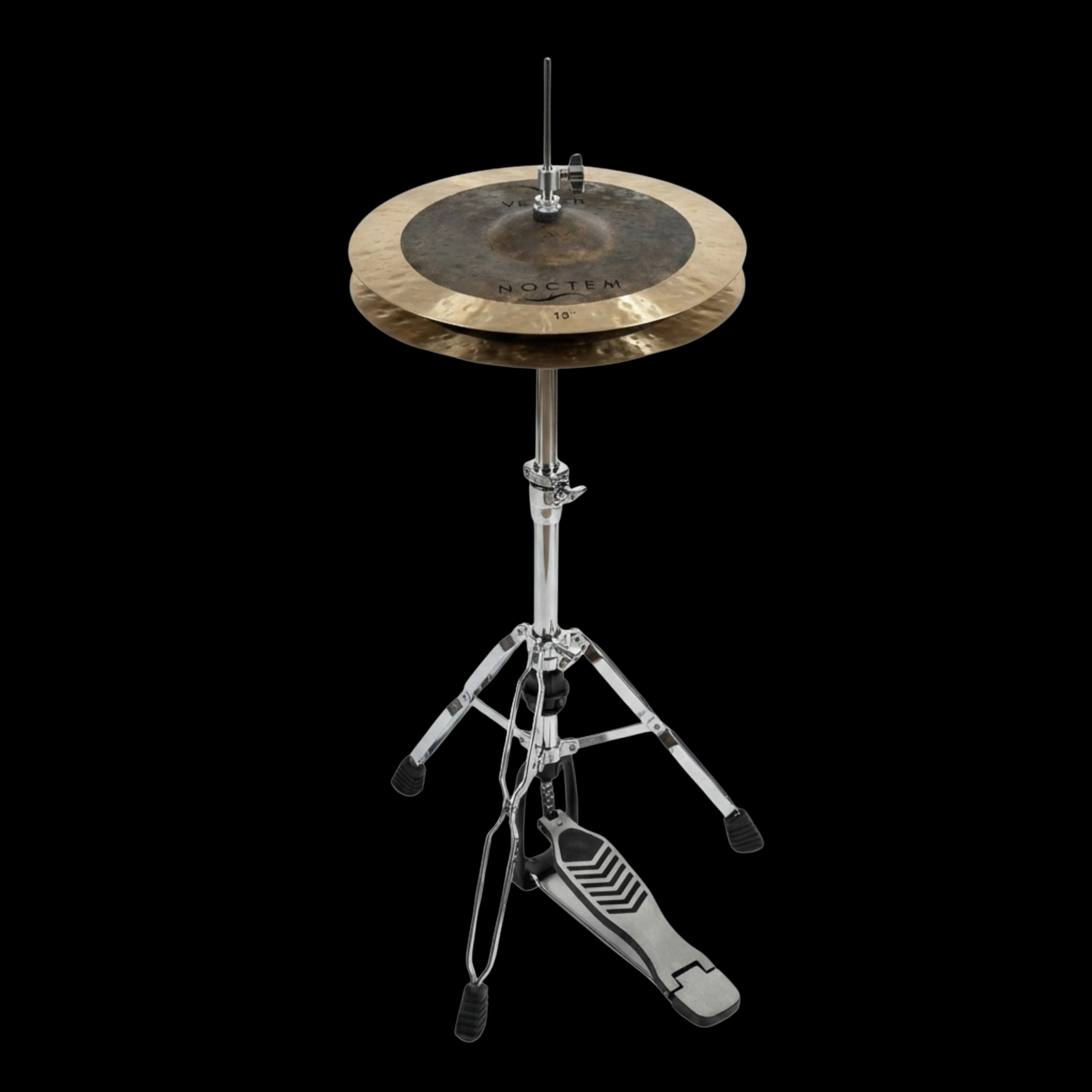 The Vesper Noctem 13-inch hi-hat cymbals offer an exceptional tonal character, making them a fantastic choice for a wide array of musical situations, from intimate studio sessions to bustling concert hall performances. Crafted from a unique B25 bronze alloy, each cymbal in the Noctem Series embarks on a meticulous journey guided by skilled artisans. This process starts with intense oven firing and precise hand hammering, carefully shaping the metal before it's immersed in a saltwater bath to refine its inherent properties. A second firing in the oven prepares the cymbal for its final artistic touch: a distinctive Diem Series-style lathe applied exclusively to the outer edges. This innovative method creates a striking visual and sonic contrast, highlighting the raw, un-lathed bell and center against the finished outer rim.